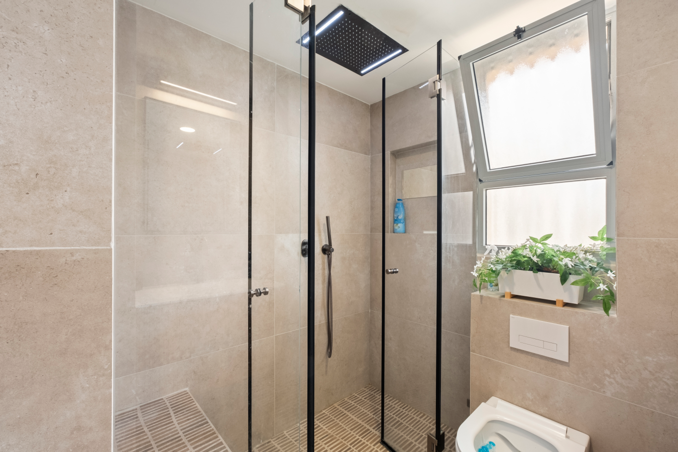 The apartment includes a stylish walk-in shower, clean finishes, and everything you need for a refreshing start or end to your day.
