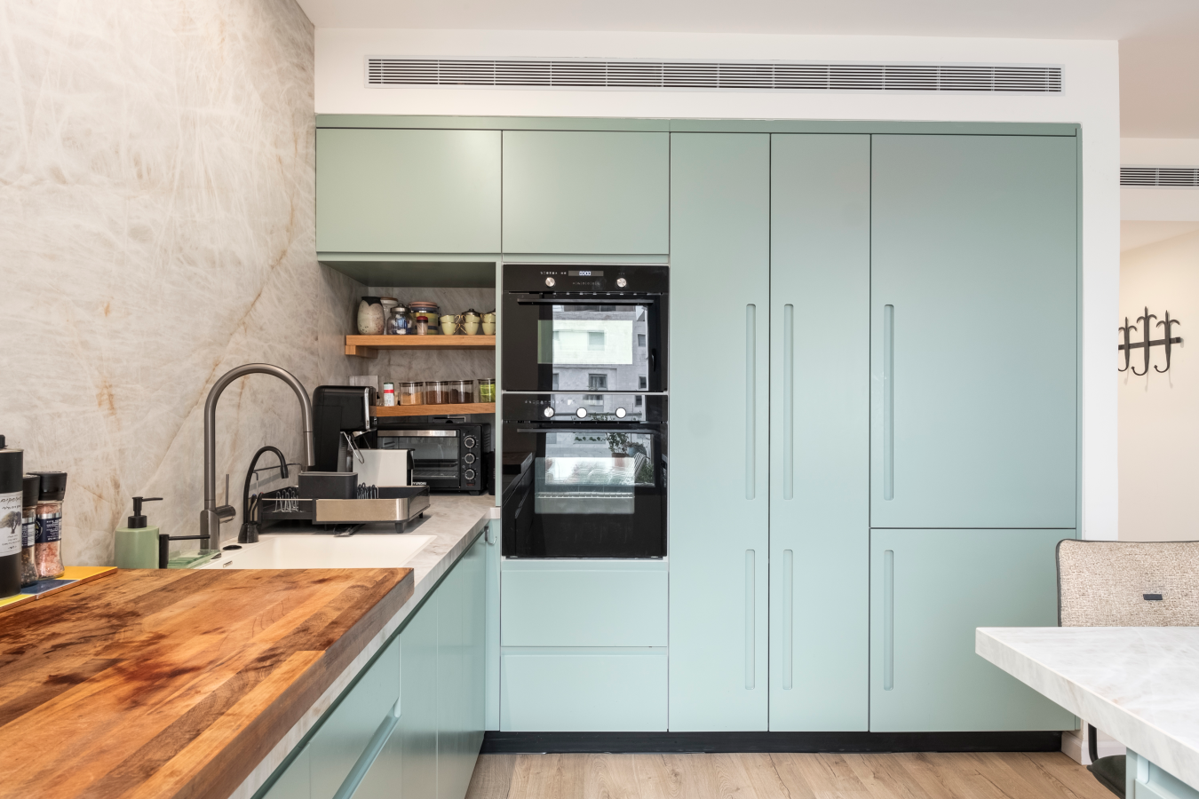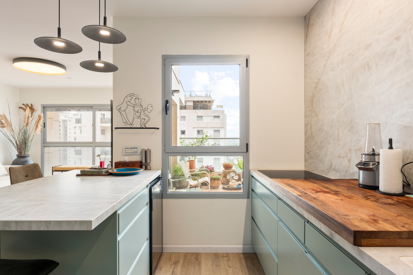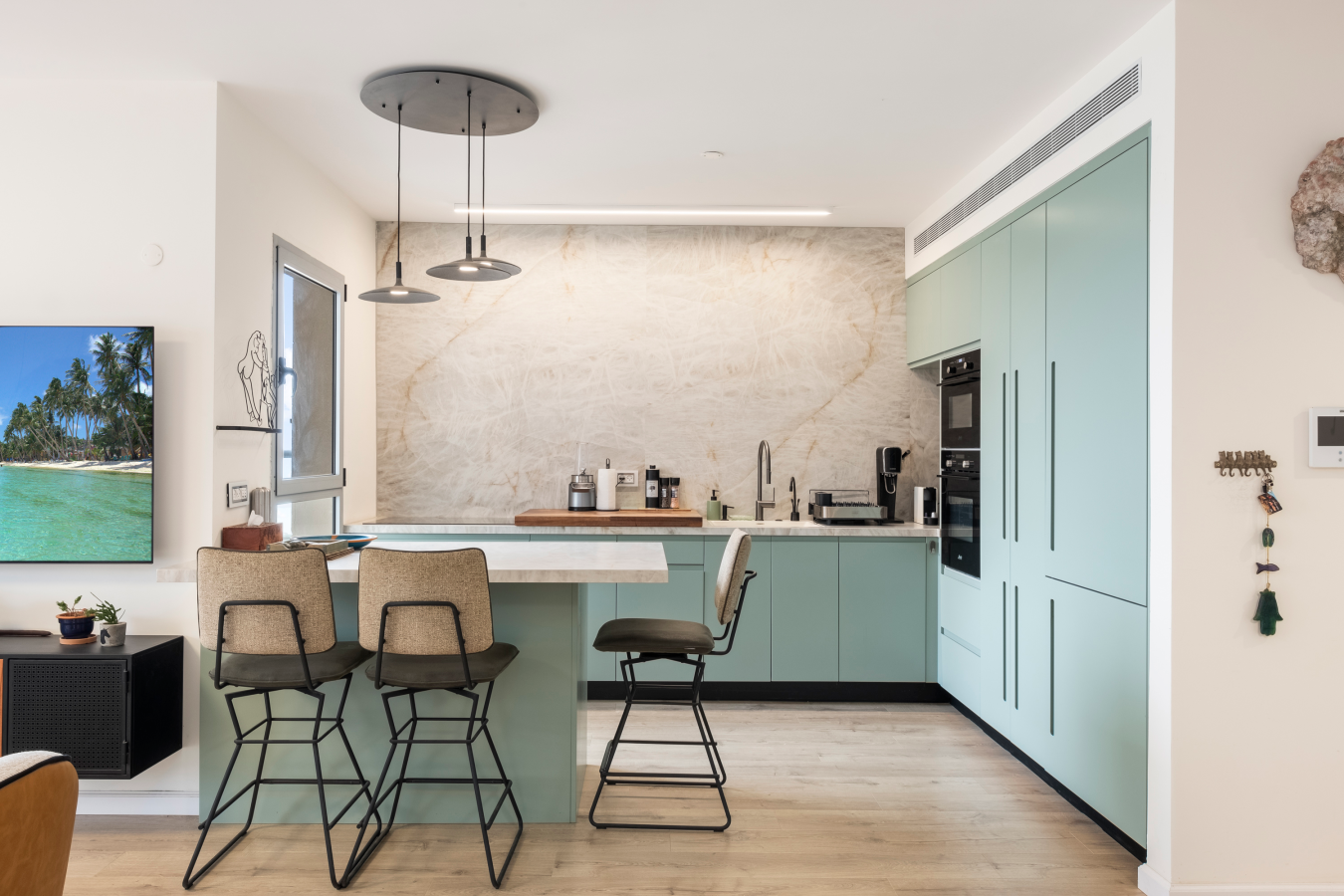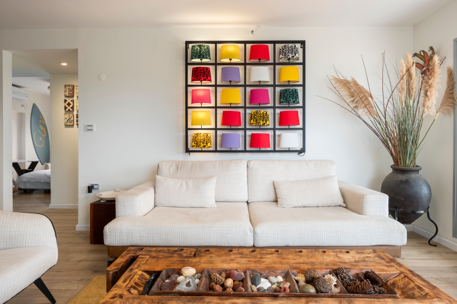 Step into 100 sqm of thoughtfully designed space, where natural light, soft tones, and vibrant artwork create an inviting atmosphere. The open-plan living and dining area is ideal for relaxing, working remotely, or enjoying a sunset meal on the furnished balcony with an open sea view.