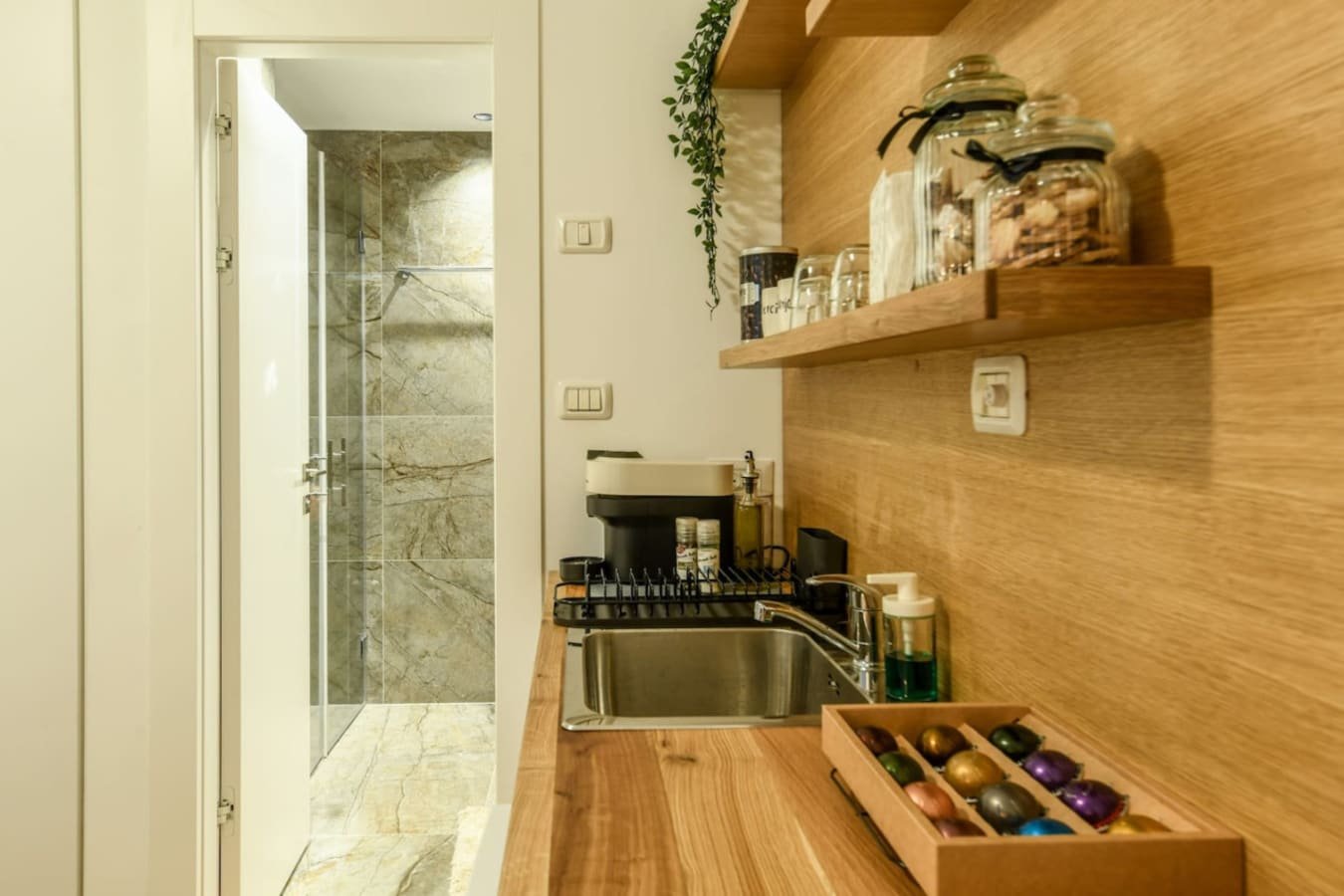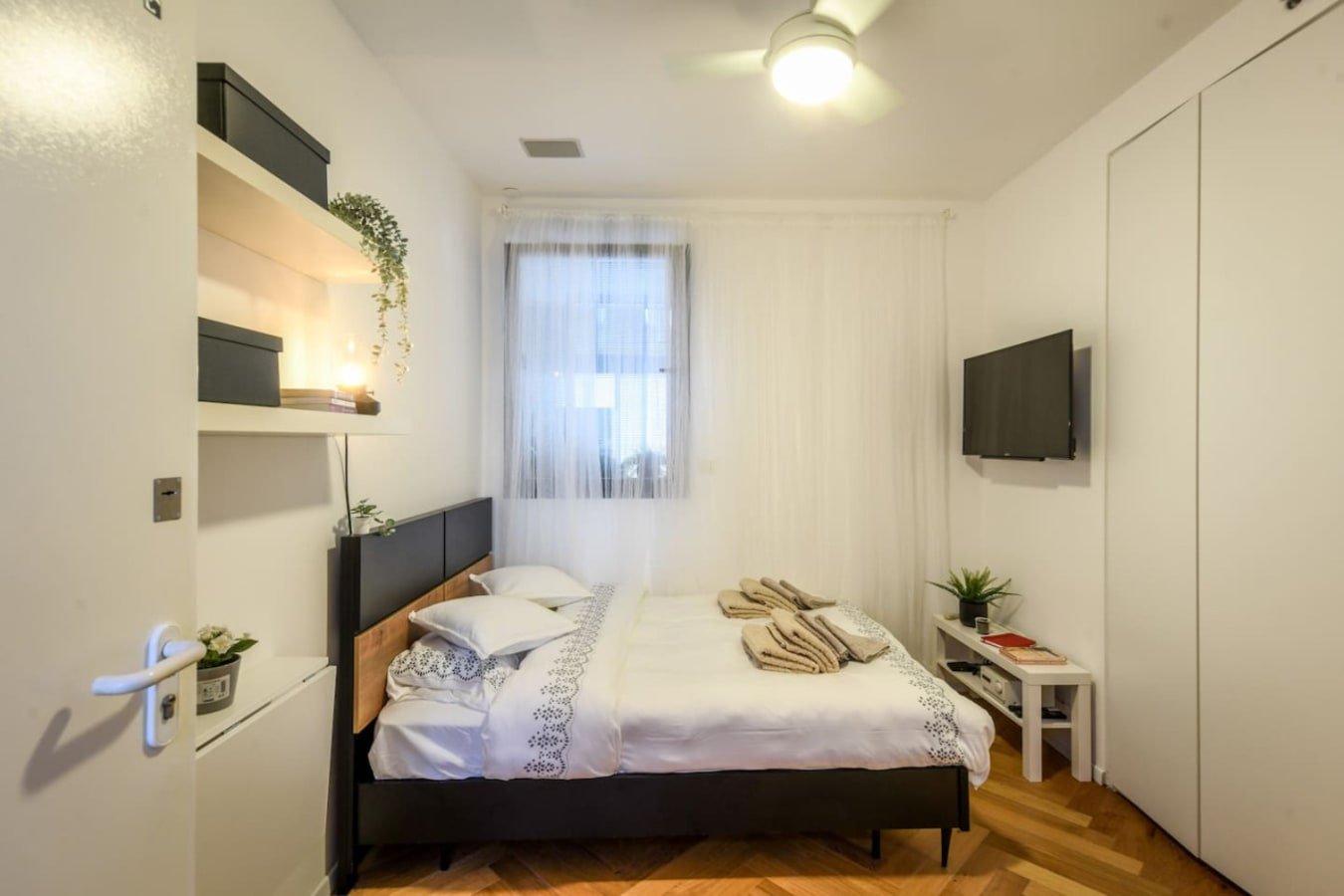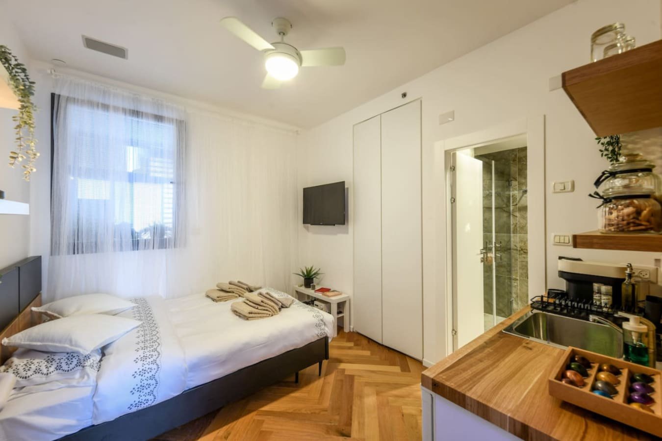 Step inside and be captivated by the warm charm of parquet flooring, tastefully curated furnishings, and a modern yet cozy design that invites relaxation. The open-plan layout features a comfortable seating area, a dining space for two, and a fully equipped kitchenette with a refrigerator, stove, oven, kettle, and espresso machine โ everything you need to enjoy meals at home.